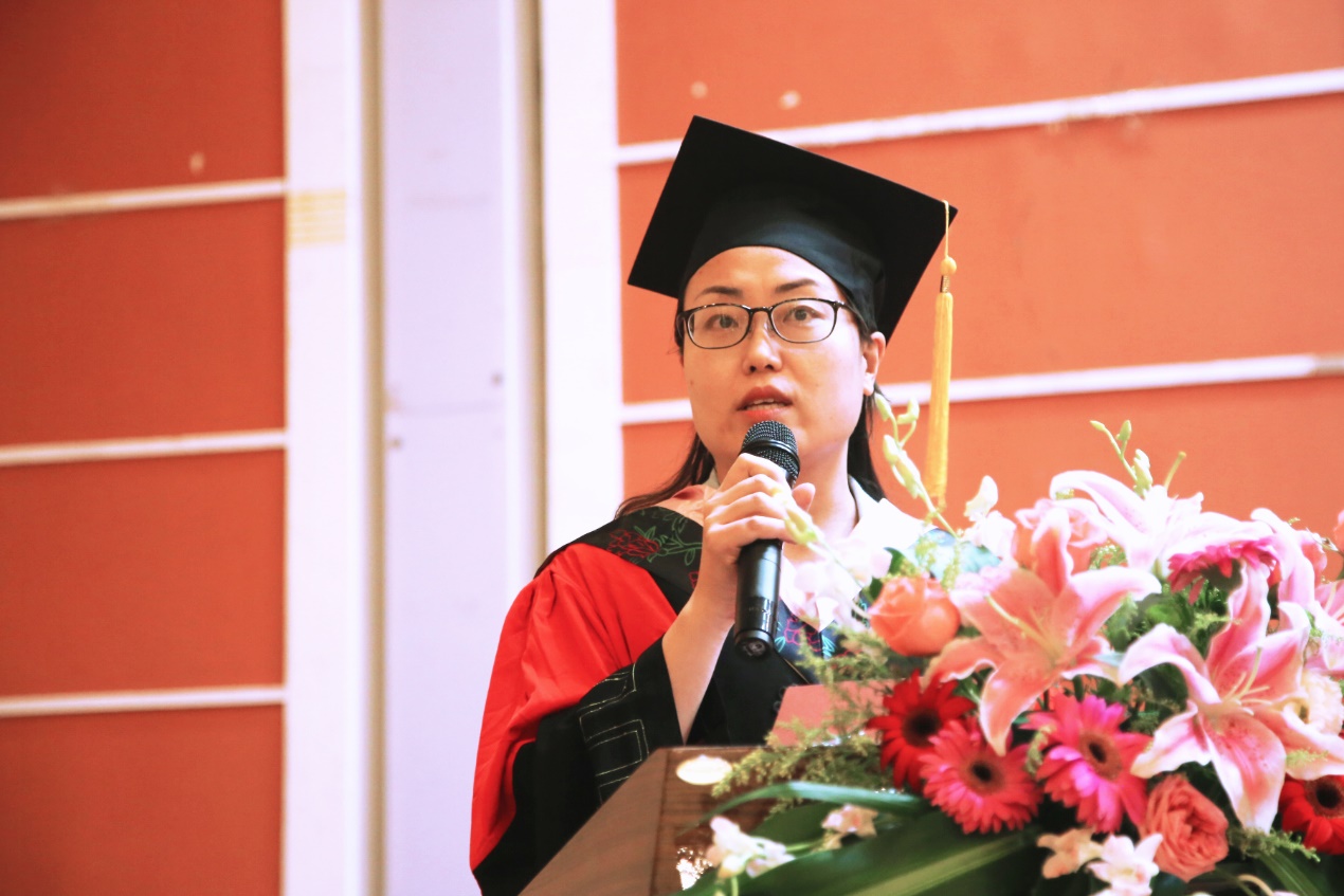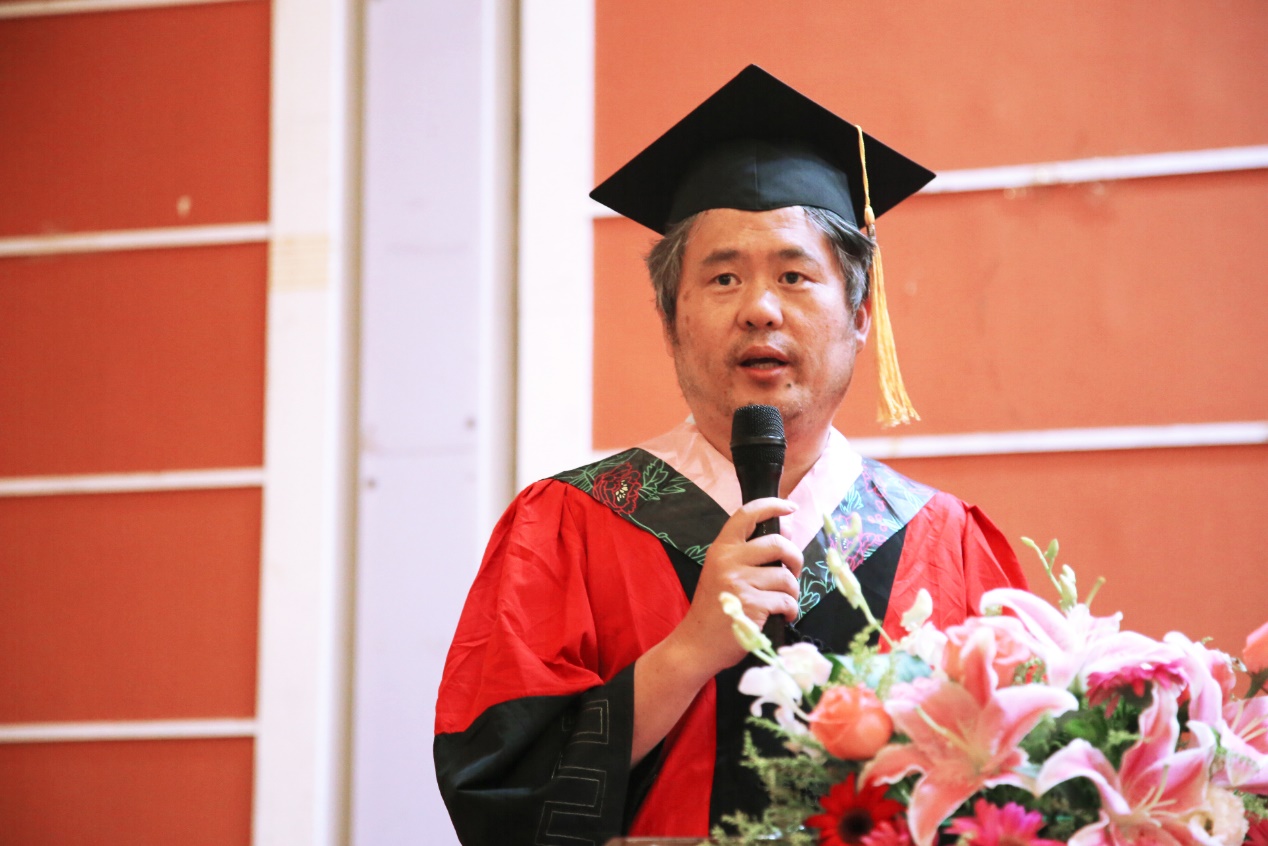 紧接着,教师代表刘拥华上台发言。刘拥华首先表达了对同学们未来的殷切期待,也回顾了与毕业生们四年相处时光中的点点滴滴,然后送上了真诚的话语与毕业学子们共勉。他为毕业生们提出了三点建议: 务必要珍惜、要谨慎、要清醒;听从内心的声音,保守内心的宁静,享受一点自由的人生;在坚持运动、保持良好身体状态的同时也要保守自己的心。
