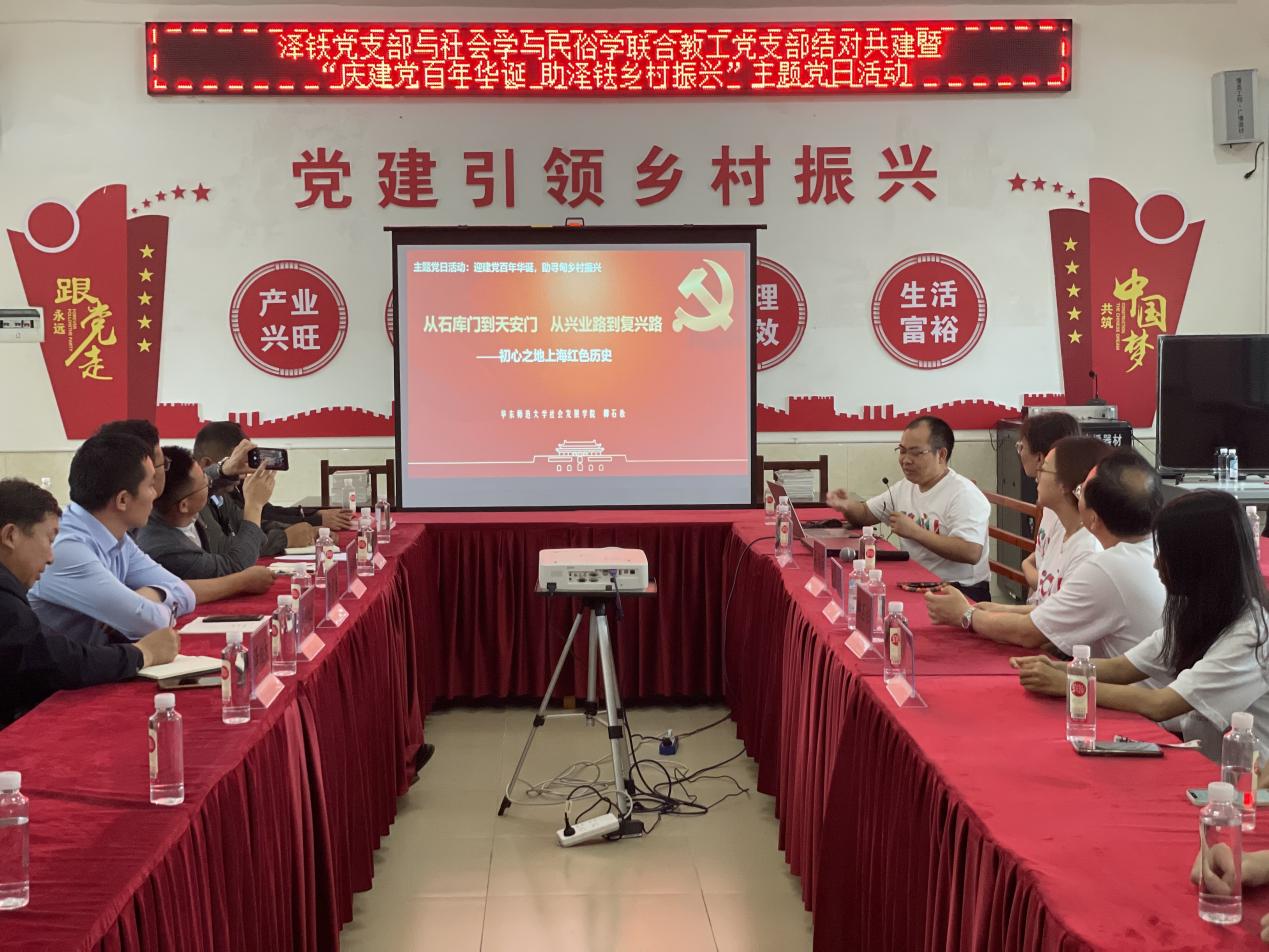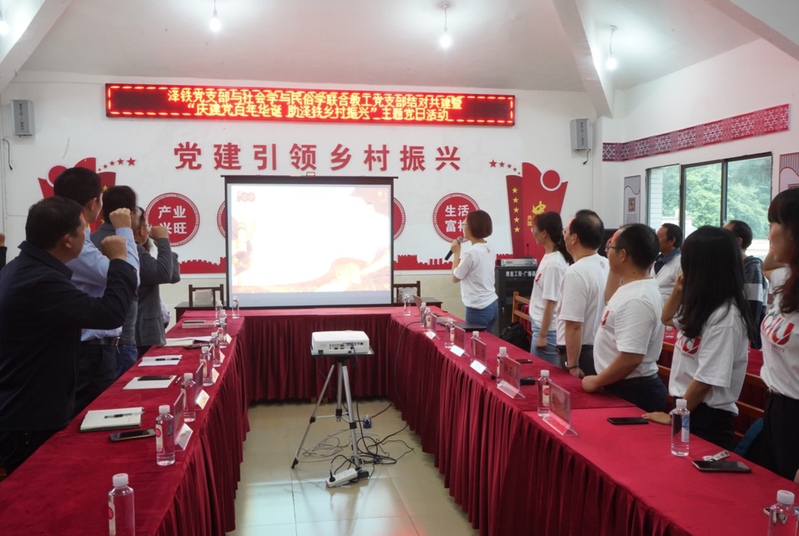 揭牌及捐赠仪式之后,3044永利集团社会学系和民俗学研究所联合教工党支部与泽铁村党支部在泽铁村开展了主题党日活动。活动伊始,全体党员起立,重温入党誓词。“我志愿加入中国共产党,拥护党的纲领,遵守党的章程,履行党员义务,执行党的决定,严守党的纪律,保守党的秘密,对党忠诚,积极工作,为共产主义奋斗终身,随时准备为党和人民牺牲一切,永不叛党。”在庄重而不失温情的氛围中,党史宣讲环节拉开了帷幕。