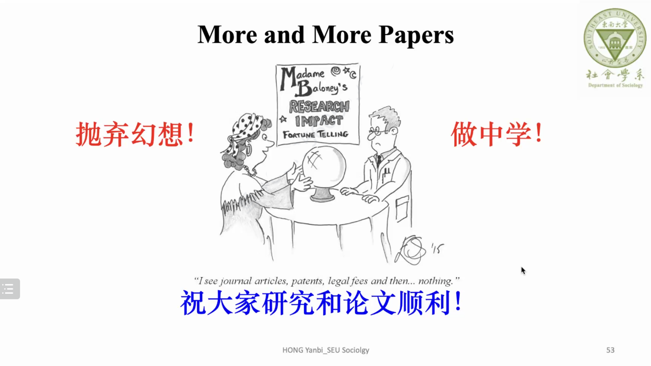 在近两个小时的分享中,洪教授旁征博引、侃侃而谈,为社会学系低年级同学打开定量研究之门提供了宝贵的启蒙源泉。更重要的是,洪教授虽然以“定性和定量研究之异同”为主题,但是却巧妙地将其放置在了更广阔、更根本的“如何做一项好的社会科学研究”的背景下展开讨论——既高屋建瓴又干货满满,使与会师生受益良多。