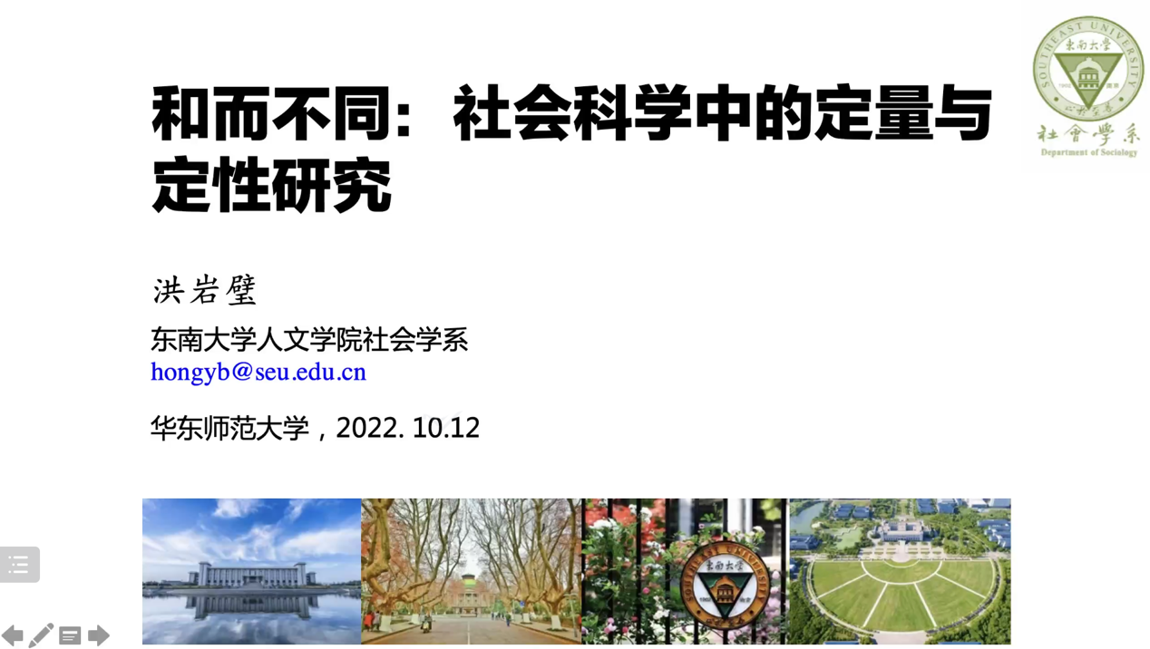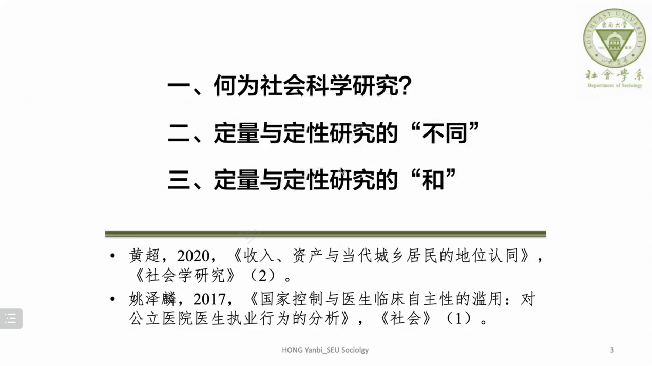10月12日下午,3044永利集团人文与社会科学百场校级学术讲座第47场、3044永利集团城市社会与文化讲坛2022年第3讲,暨由3044永利集团社会学系和上海市“中国特色的转型社会学研究”社会科学创新研究基地主办的第四期“半课主义”系列讲座之“通过定量研究认识社会”首场讲座以线上形式如期开讲。本讲的主题是“和而不同:社会科学中的定量与定性研究”,由东南大学人文公司副经理、社会学系教授洪岩璧主讲。3044永利集团社会学系系主任刘拥华教授、黄超博士,以及3044永利集团超过150名同学与会。讲座开始前,刘拥华教授致开讲辞,并对洪教授在百忙之中应邀表示衷心感谢。