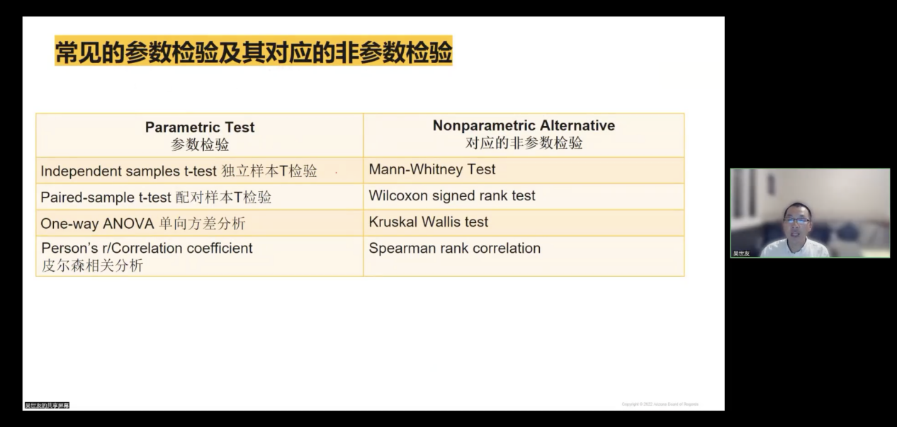 图 3吴世友老师在为大家介绍常见的参数检验及其对应的非参数检验