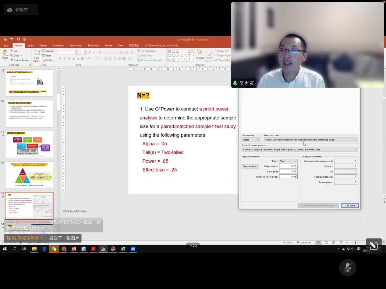 讲座伊始,吴世友老师简单阐述了小样本分析在社会工作中的独特意义。接着,吴老师对干预研究及样本量、基于小样本的数据分析、小样本数据发表的论文案例以及小样本干预研究的意义四个模块分别展开进行详细的讲解。在干预研究及样本量部分,吴老师指出因为社会工作干预研究通常针对社会弱势人群,比较难找到大样本数据;干预项目时间长、次数多,容易导致人员流失等,所以通常样本量较小,但我们可以通过样本数据,对整体情况进行统计推论,但并不是所有的样本都可以推论整体。另外,社会工作干预的人群有时候会较难找到总体样本,干预研究更多的时候是为了开展组间比较,因此需要专门软件计算所需的样本量。随后,吴老师用G*power为我们演示如何在达到一定的统计功效的前提下计算所需的最少的样本量,并邀请同学们进行屏幕共享一起来交流。