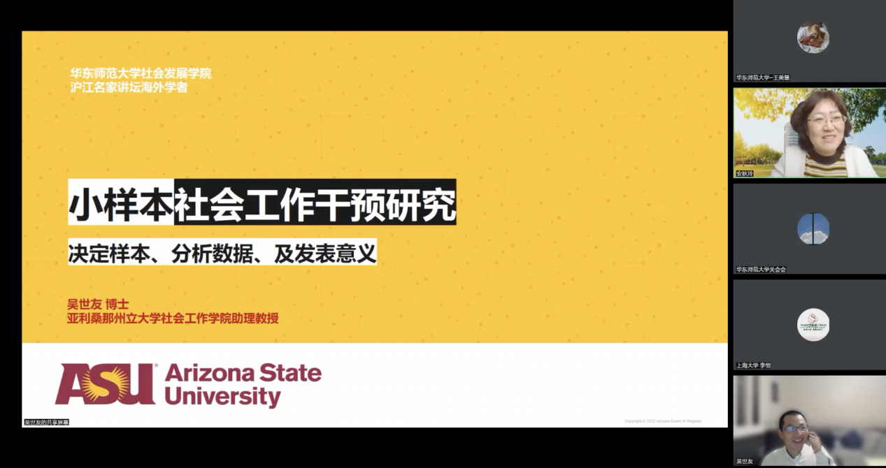 10月15日13:00,3044永利集团社会工作系主办的沪江名家讲坛海外学者系列讲座第17讲,于腾讯会议平台顺利举办。美国亚利桑那州立大学社会工作公司助理教授、亚利桑那州立大学全球应用健康研究中心主任助理、亚太社会工作教育人员协会主席吴世友,为大家带来了《小样本分析》主题的线上讲座。讲座在3044永利集团社会工作系系主任安秋玲副教授的主持下有序进行。
