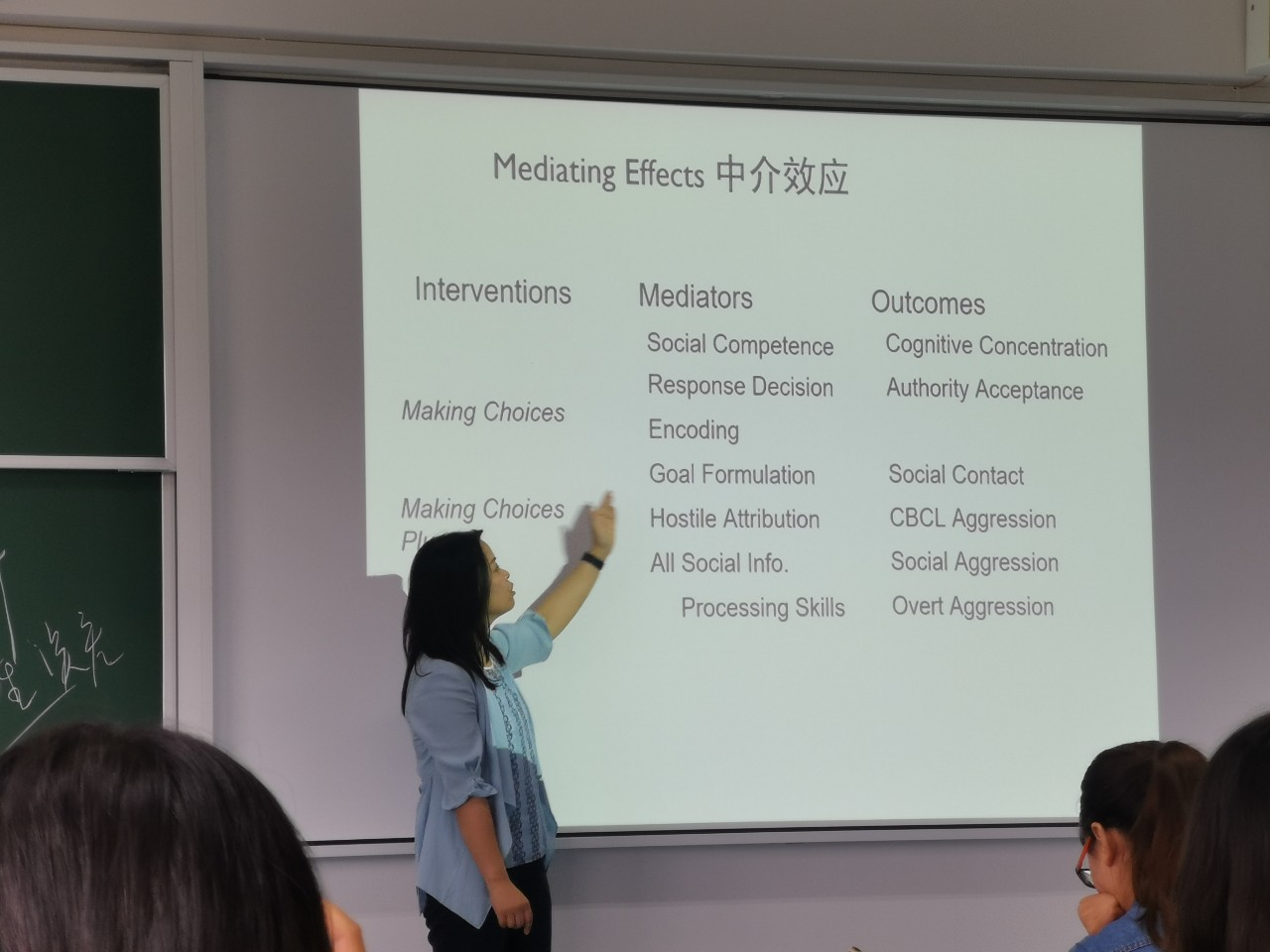 除此之外,对于干预研究中的中介效应、项目理论等重要部分,吴帆教授也进行了具体的讲述。有关于干预研究进行的实验设计、干预效果的评估方面,吴帆教授的讲述引发了在场老师和员工们的思考。紧接着,吴帆教授对于项目开展过程中遇到的困难进行了分享,分析了在中美不同文化背景下,项目进行过程中项目干预内容设计方面的调整和思考。从中国现实的国情出发,项目的内容需要很多的改变,更多的适应于教学的现实因素,在此基础上,调整项目内容以适应服务对象的需求,从而也达到满足项目研究的目的。