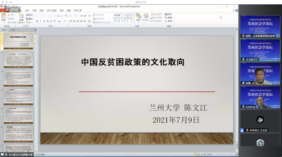中国社会学会副会长、兰州大学哲学社会公司陈文江教授详细剖析了中国反贫困政策的文化取向,他在讲解贫困的问题化、贫困的内涵与测量以及贫困的理论演变的基础上,指出中国反贫困政策的文化取向主要体现在反贫困的价值目标、主体依托、机制保障以及评价方法四个方面,对从绝对贫困到相对贫困的转型有了深刻的揭示。