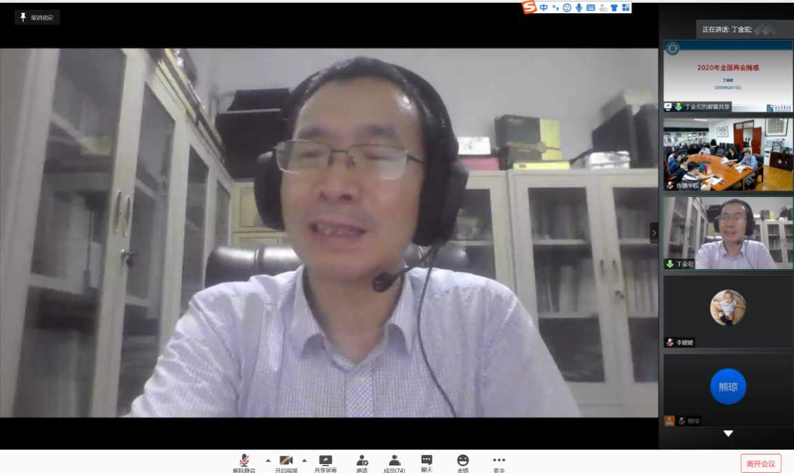 随后,丁金宏委员对政府工作报告进行了细致解读。他肯定了我国去年的工作成就,但也表示今年面临着严峻的疫情困境。他认为,面对目前的形势,我们既要保持相对乐观的态度,原因在于中国疫情得到及时防控,和其他国家相比赢得了发展的时间差,政治制度的优越性在应对重大危机挑战时,也得到了最充分的体现。我们要坚持苦战,压缩非必要开支,花大力气谋发展,不抱怨,全国上下团结起来干实事;要保证实事就是的工作作风不能丢,制定积极而理性的发展目标,做好“六保六稳”,进行宽严相济的社会管理。此外,丁金宏还介绍了两会中民法典、香港国安法的审议情况。