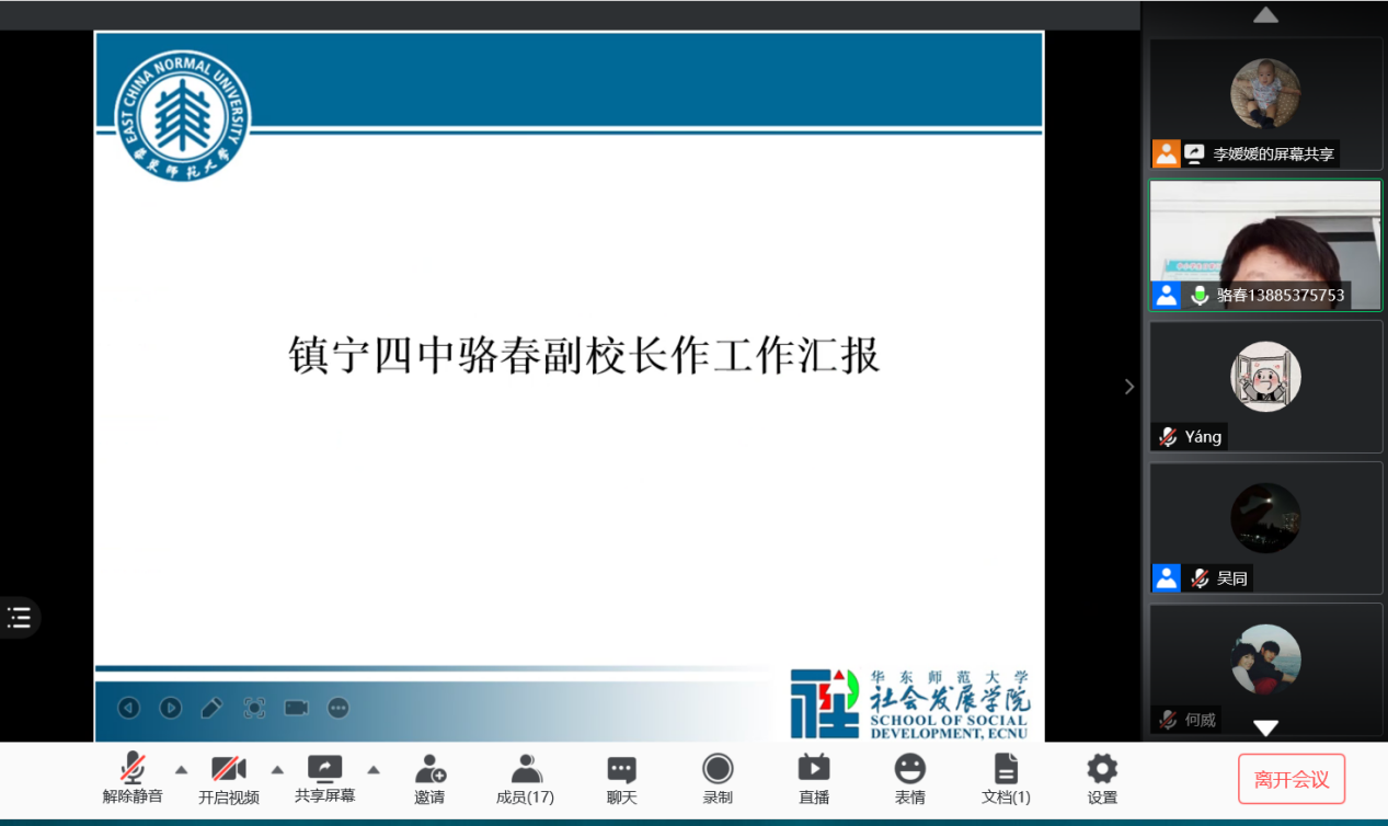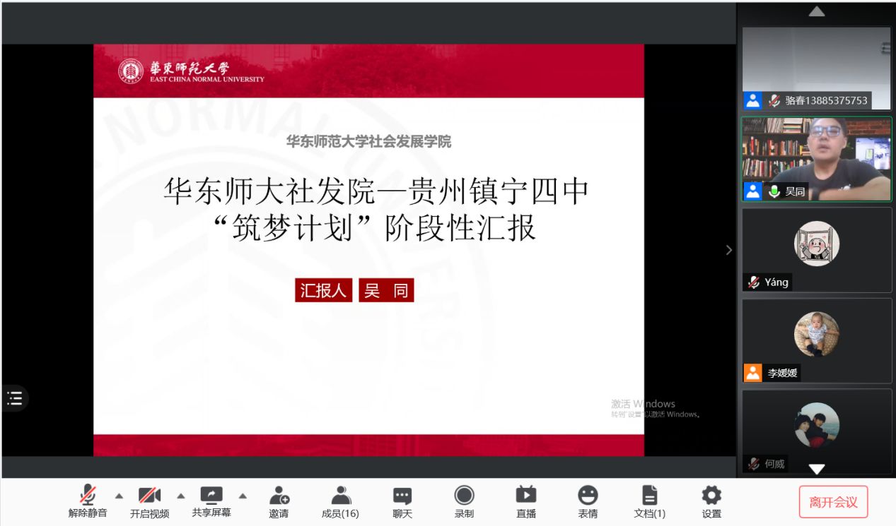 会议伊始,社会工作系和人口学研究所联合教工党支部书记吴同副教授对目前“教育筑梦”计划进行阶段性汇报。吴同老师从五个方面进行总结:一是千里传音,共商筑梦。吴老师从“教育筑梦”的缘起谈起,提到3月第一次线上见面,明确实施计划并达成初步方案。二是实地考察,传经送宝。4月,带队前往镇宁四中实地走访调研,开展关于留守儿童的心理干预的方法讲座,并开展交流座谈,了解需求。三是爱心捐赠,书香传情。由支部购买学习用书和课外阅读用书捐赠给镇宁中学。四是情系留守,爱暖童心。配合支持骆董事长开展调研工作,形成完整的调查报告。五是走进师大,教育圆梦。为镇宁四中两位教师申请到教师培训名额,在华东师大接受培训学习。
