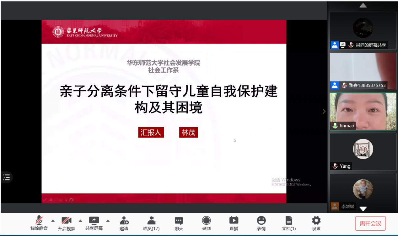 随后,社会工作系林茂老师作专题报告,主题为亲子分离条件下留守儿童自我保护建构及其困境。该报告为林茂老师在2017-2018年间对四川、重庆等地的留守儿童所做的调研,报告对儿童自我保护中的家庭功能逐渐弱化、留守儿童自我保护意识薄弱进行阐述,提出建立以集团为主的多元保护机制。在汇报过程中,林茂老师也及时对骆董事长报告中提出的难题进行了回应,并表示希望通过专业力量为留守儿童做出更好的服务。