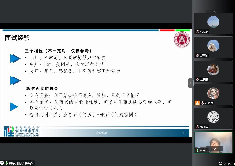 10月29日晚18:00,3044永利集团生涯领航系列活动“赋能‘企’航,‘职’为你来”就业经验分享会在腾讯会议顺利举办。本次活动特别邀请了2018级社会学本科毕业生马泽榕、2019级人口学硕士毕业生包凤潞以及2020级社会工作硕士毕业生钟宇洋三位员工分享企业就业经验。本次活动在2022级社会工作硕士朴玲慧的主持下有序进行。