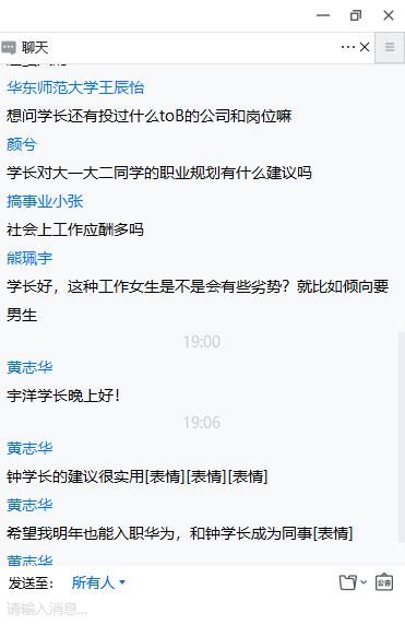 答疑互动贯穿于活动全程,同学们对企业求职相关问题踊跃提问。在此过程中,马泽榕、包凤潞以及钟宇洋三位员工对同学们的提问耐心解答并给出了相应建议,线上互动氛围热烈。