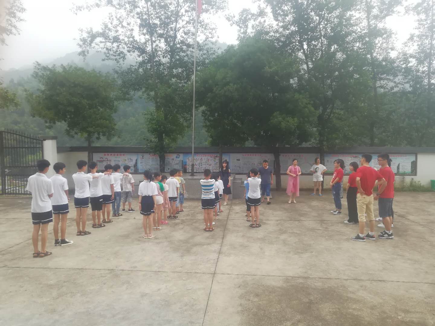 7:30,云销雨霁,同学们在陈董事长以及余队的带领下迅速整理好了队伍,升国旗、奏唱国歌。