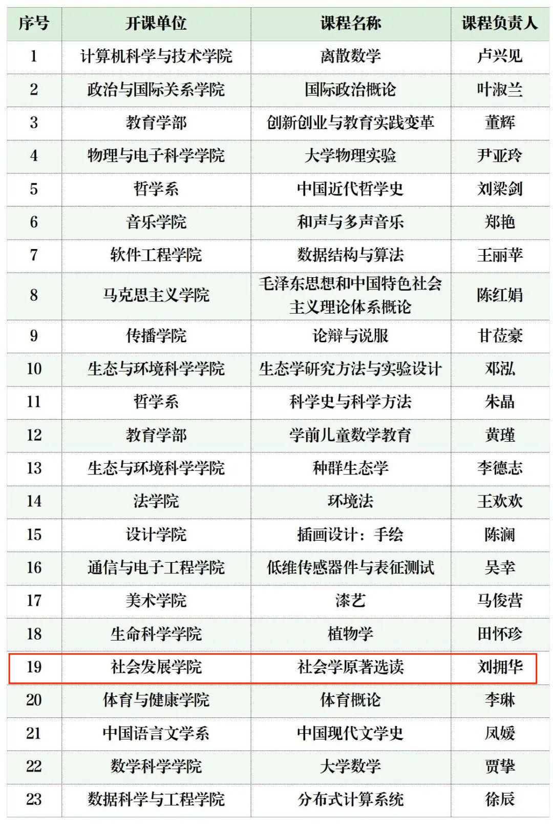 日前,上海市教委发布了《上海市教育委员会关于公布2023年度上海高校市级一流本科课程认定结果的通知》(沪教委高〔2024〕2号),认定400门课程为2023年度上海高校市级一流本科课程。公司23门课程入选2023年度上海高校市级一流本科课程,累计共有94门课程入选上海高校市级一流本科课程。其中,公司刘拥华老师的《社会学原著选读》课程入选。