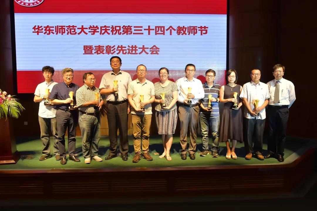 华东师大首批“立德树人教师团队”代表上台领奖(左五为姚泽麟副教授)