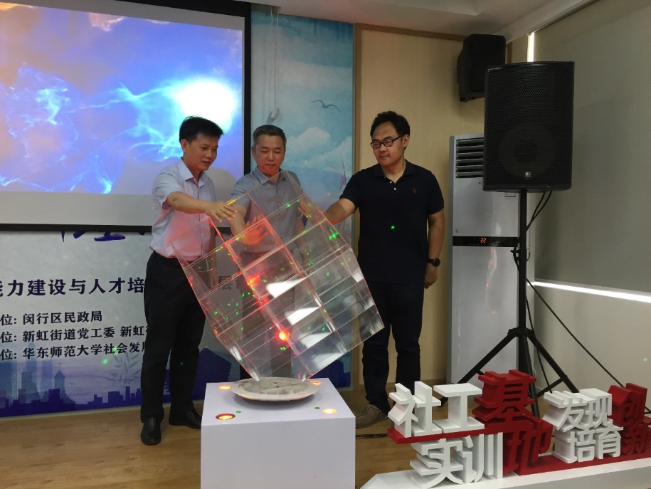 除了双方共同课题的合作,新虹街道还启动了社区工作者能力建设的云平台,该平台也将由社发院有着实务经验和理论深度的教授专家提供线上授课。随着云平台的魔方开启,实训基地揭牌仪式也进入了高潮。