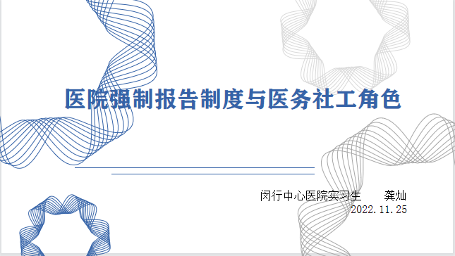 在实习生分享结束之后,由龚灿同学带领大家一起共同学习医院强制报告制度。她首先细致地介绍了强制报告的责任主体、报告的内容情形、未报告的法律责任以及法律层面对报告主体的保护。之后从社会工作的视角切入,介绍医务社会工作在儿童危机干预中的专业优势体现,总结了医务社会工作可担任的角色,最后指医学诊断加上社工的社会性诊断,形成全人评估视角,达到对受虐儿童的最优评估,才能更好地为他们提供服务。