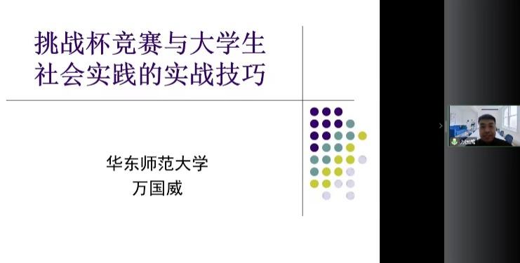 万老师首先结合自身参赛经验,介绍有关挑战杯竞赛的主题内容与内在规律,鼓励同学通过以赛带练的形式去增强对学术性问题的探讨、对系统性研究的探索。