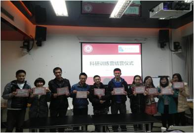 第六次活动为科研训练营的结营仪式,其中包括二个部分,其一是李初旭学姐为大家介绍忆图软件和Prezi软件的功能以及制作思路,并在实际操作中向同学们提出制作过程中应该注意的事项。同学们积极参与提问和讨论,现场气氛热烈。其二就是结营仪式,这部分由孙志鹏学长为大家播放了一段视频开始,和同学们一起回顾了之前五期科研训练营的学习过程,并做出了总结和归纳。在共计六期的科研训练营学习过程中,研究生会根据同学们的表现和参与度评选出了两位优秀营员,并由孙志鹏学长为荣获“优秀营员”称号的张磊学长和付颖静同学颁发荣誉证书,其他的同学也获颁了结业证书。除了证书之外,所有营员也都收到了一份“冬日的温暖”—巧克力,并集体合影留念。