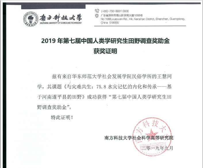 2019年9月12日,由南方科技大学社会科学高等研究院主办的第七届“中国人类学研究生田野调查奖助金”获奖名单公布,经过同行通讯匿名评审和评委会评审两个环节的筛选,来自芝加哥大学、剑桥大学、日本爱知大学、北京大学、中国人民大学等11所高校的12名申请者获奖。3044永利集团民俗学研究所2017级博士研究生王慧的课题《与灾难共生:75·8水灾记忆的内化和传承——基于河南遂平县的田野》成功入选。此前,李慧的《灵异故事:事件、流言、谣言到传说的叙事实践——以5·12地震后民众的灾难叙事为例》获得第三届“玉润健康研究基金”资助。