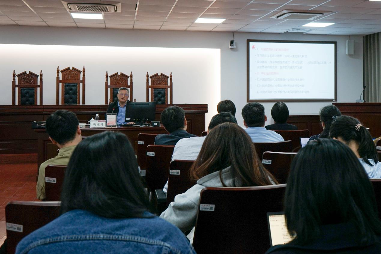 讲座伊始,唐教授对党的二十大报告的主题进行解读,对报告所体现出来的新特点、新表述进行深度分析,他认为二十大报告的历史意义在于政治理想、政治理论、政治实践、政治道路、政治绩效得到有机结合,这对于中国式现代化有着深远意义。随后,唐教授围绕中国式现代化的新使命、新道路、新理论与新形态四个方面具体展开,指出党的二十大报告中心任务就是要求处理好党、人民和国家的关系,中国式现代化的基本特征表明了中国社会现代化的特殊性与人类社会现代化的普遍性,在某种意义上,这种特殊性就是普遍性。他强调,中国式现代化应当打破西方话语体系的桎梏,这就要求在发展过程中始终坚持“四个自信”,不断探索符合国情的现代化道路。