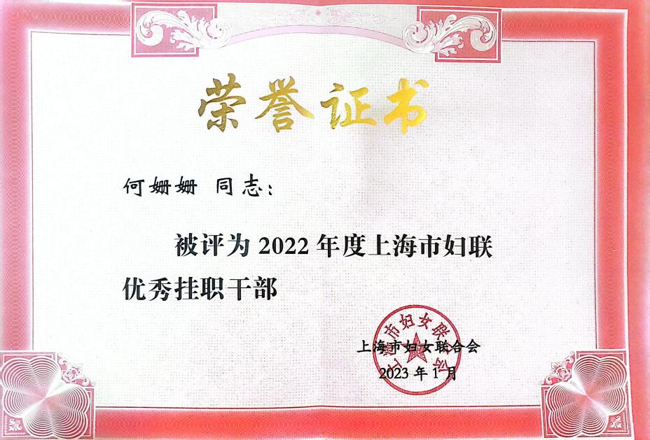 2022年1月-12月公司社会工作系何姗姗老师在上海市妇女联合会家庭儿童部挂职副部长期间主要负责儿童工作,在切实领悟习近平总书记对儿童事业深远的战略谋划的基础上,把习近平总书记的关心关爱转化为做好儿童工作的实际行动,不忘初心使命,砥砺前行,扎实推进各项具体的儿童关心关爱工作,夯实了“邻家妈妈”专项工作,参与相关儿童工作政策文件制定,推动困境儿童关爱保护工作的顶层设计,进一步深化困境儿童关爱帮扶。鉴于其在挂职期间的突出工作表现,2023年1月何姗姗老师被评为“2022年度上海市妇联优秀挂职干部”。