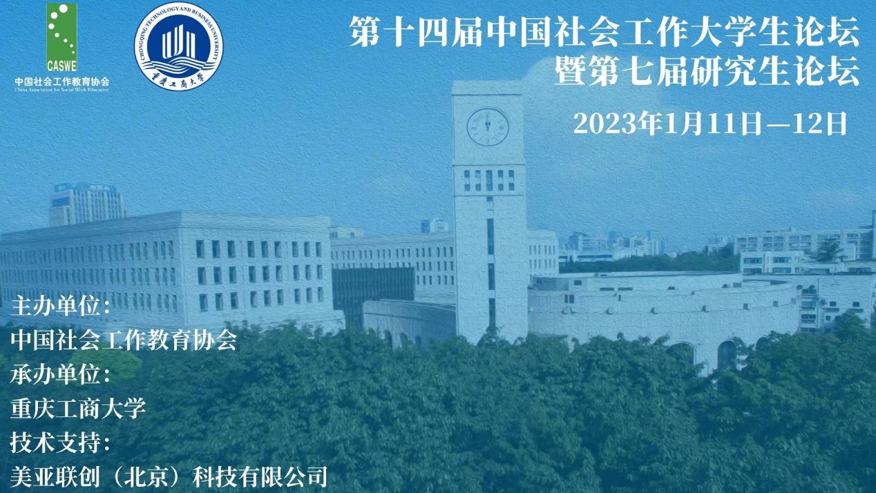 2023年1月11日至12日,由中国社会工作教育协会主办、重庆工商大学法学与社会学公司承办的“第十四届中国社会工作老员工论坛暨第七届研究生论坛”在线上成功举办,来自全国110余所高校的400余名社会工作师生参加了本次论坛。