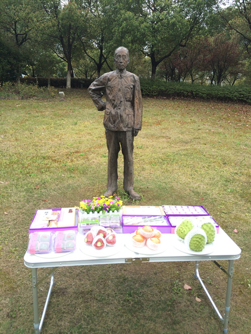 礼毕后,众人来到孟宪承先生的塑像前,手捧雏菊,逐一排开,孟先生的铜像前也已整齐摆放着祭品,如青团、释迦果。清明祭扫活动正式开始。祭扫伊始,由民俗学专业的同学朗读清明祭扫倡议,使人们意识到举办这次活动的目的。随后,丁金宏老师上前讲话,阐述祭扫先贤对于师大学子的重要性。不知不觉,天空飘起了淅淅沥沥的小雨,为活动渲染了更加庄严的氛围。在祭孟宪承文的诵读声中,在场的每个人都神情肃穆,思绪仿佛飘至先师的年代。最后,每个人上前对着孟宪承先生的塑像献花并三鞠躬。至此,祭扫孟宪承先生的仪式正式结束。