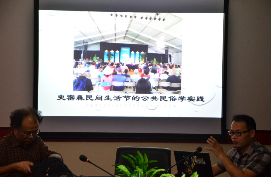 报告会期间,王老师通过讲解美国史密森学会的民间生活文化节指出美国公共民俗学实践的活态性、社区化、注重个性化的特色。他先从在美国生活的小区入手,讲解这个小区的社区节日和社区文化发展。然后讲他参加的华盛顿国家广场上的史密森民间生活节,今年主题国家是中国和肯尼亚,生活节上有各种文化展示和表演,展示人员与美国民众和游客的互动。史密森民间生活节能够超出地域界限,举办各国生活节并很好地发展下来,是公共民俗学实践的活态化的成功。