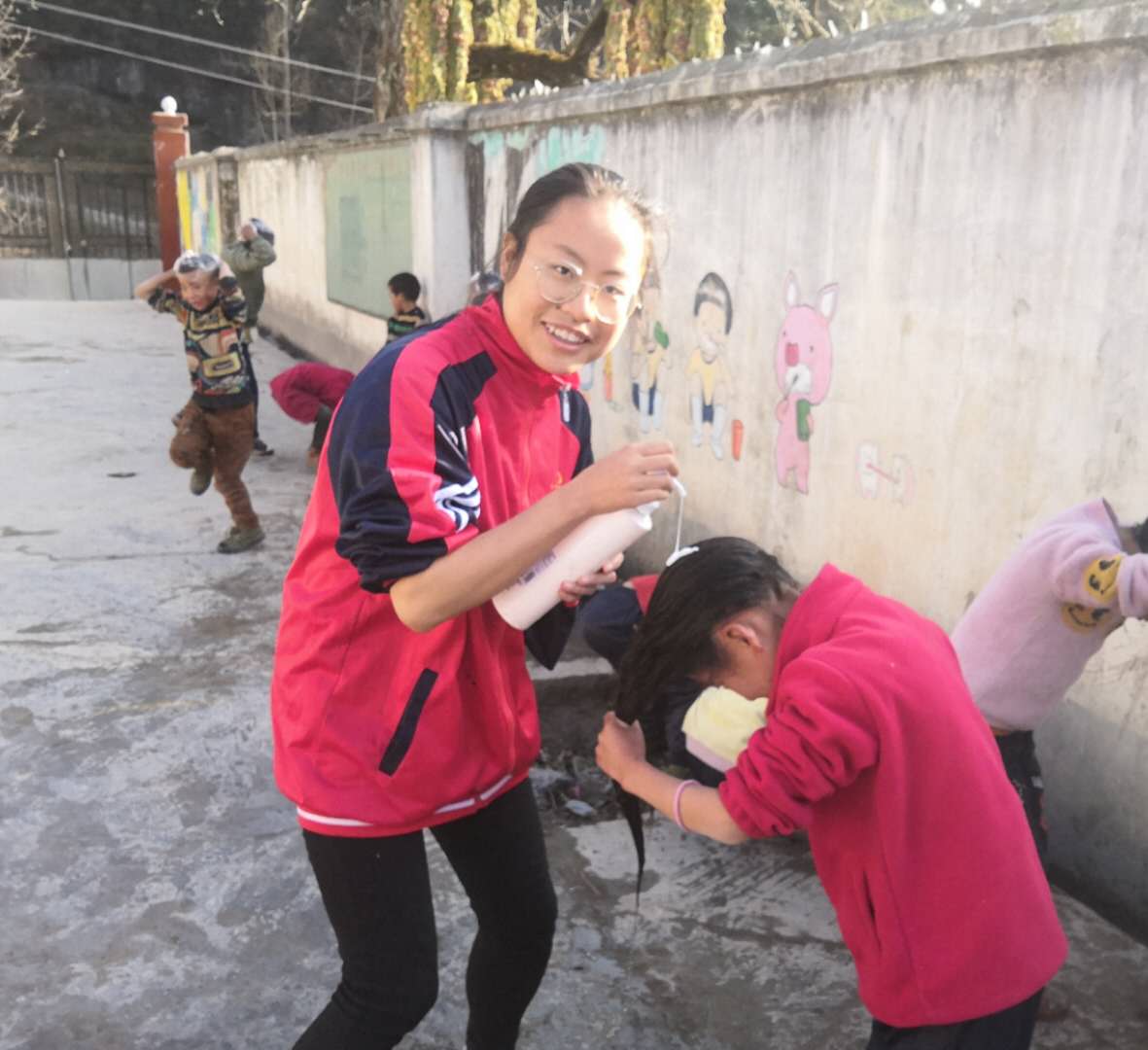 这里的员工基本上都是彝族孩子,大部分人的爸爸在外地打工,妈妈在家照看子女。员工们都住附近的村子里,每天走路来上学,路程最远的,要步行40分钟左右。中午,他们在公司享用免费的“阳光午餐”,支教老师有时候也会集体从山下采购食物,跟孩子们一起分享。山村里的家庭常常没有给孩子刷牙洗头的意识,翁婷婷和其他老师便又担起了“生活老师”的职责,利用午间的休息时间给孩子们洗头。