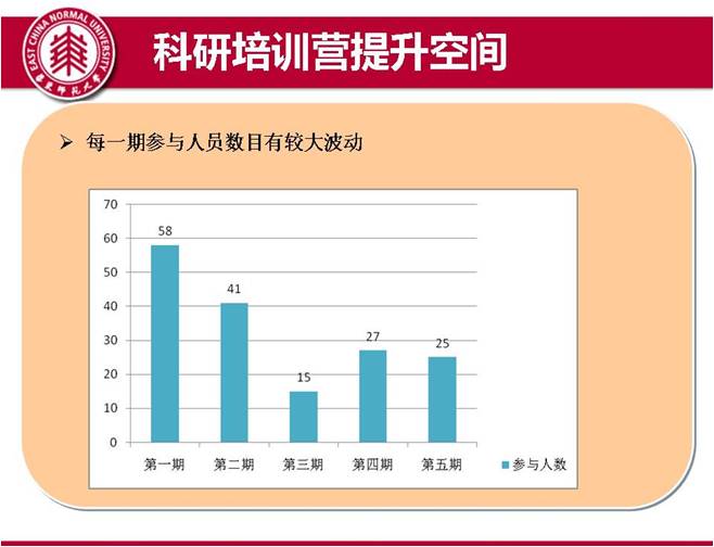 这次科研训练营的活动,活动历时时间长,参与人数较多,其中包含了全校的16个公司的员工以及访问学者。虽平均每场有33人参加,但总观每场活动的参与人数波动比较大,说明大家对科研训练营的活动有不同的需求。
