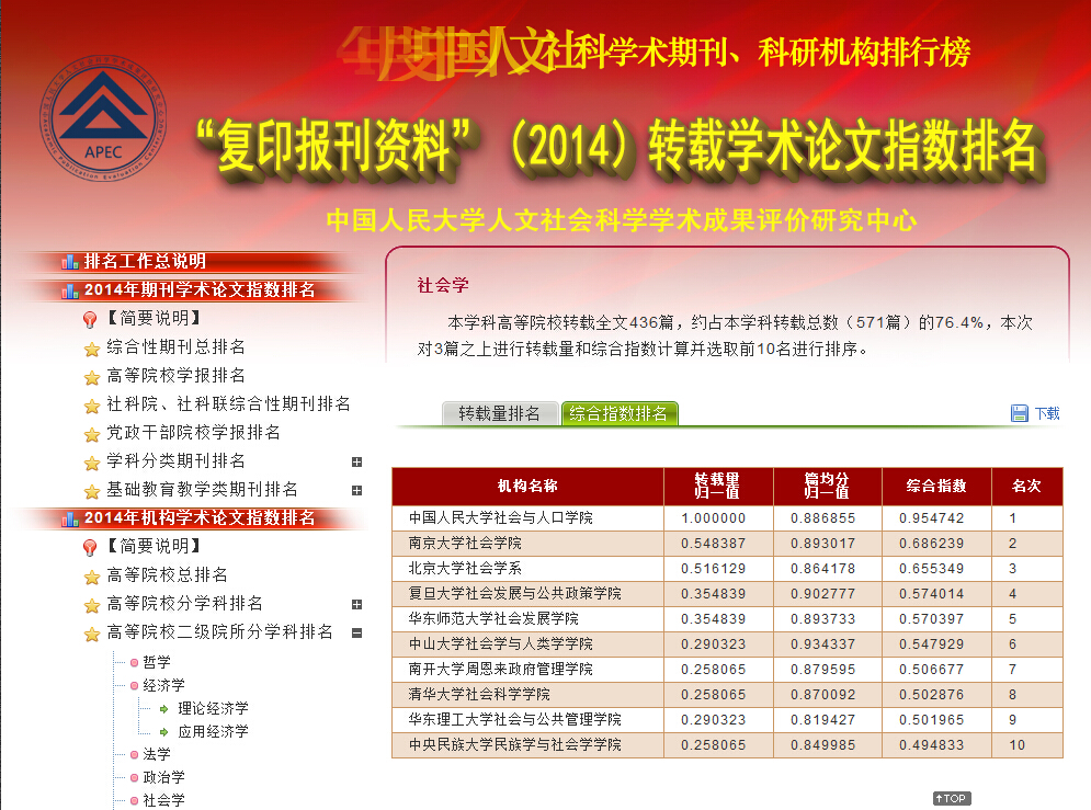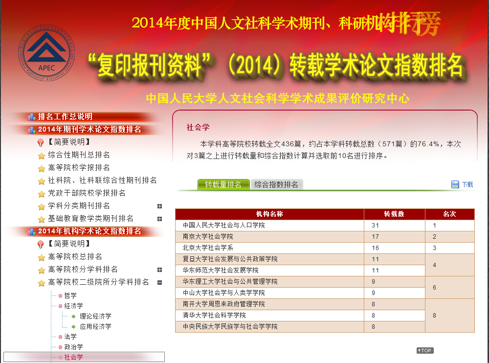 目前,中国人民大学人文社会科学学术成果评价研究中心公布了人大“复印报刊资料”(2014)转载学术论文指数排名。这一排名是根据论文作者所属机构,从转载量和综合指数两个量度,按专业学科对高校及其二级院所进行排名,公司在转载量排名中与复旦大学社会发展与公共政策公司排名并列全国第四,在综合排名中列全国第五,与前一年的排名保持一致。在学术竞争激烈的背景下,公司能保持排名前列,是大家共同努力的成果。