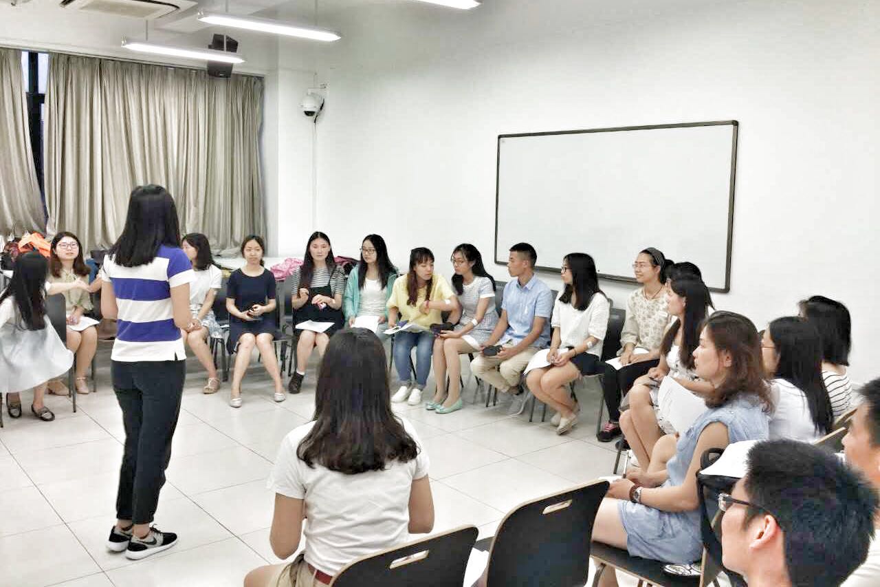 培训主要分为基础团队建设和项目分工职责的理清。在破冰环节,韩晓燕教授通过冥想,郭娟老师通过“丢飞机”等游戏增进了大家的投入感和认识。随后,培训者对团队进行了分组,评估员与班主任配对,并通过信任行游戏增强组员之间的互动、沟通和信任。组员中的一人蒙上眼睛,需在另一个人的指引下走完一段“坎坷不平”的路途。在这个过程中,组员间相互扶持,配合默契,穿过了重重阻碍,最终都很顺利地到达了终点。此后,郭娟老师让组员间进行了一次“欣赏式探寻”,这让彼此之间的了解又加深了一步,并理清参与者对本次活动的期待和成长需求。