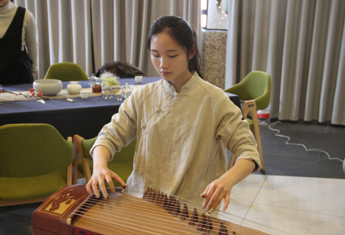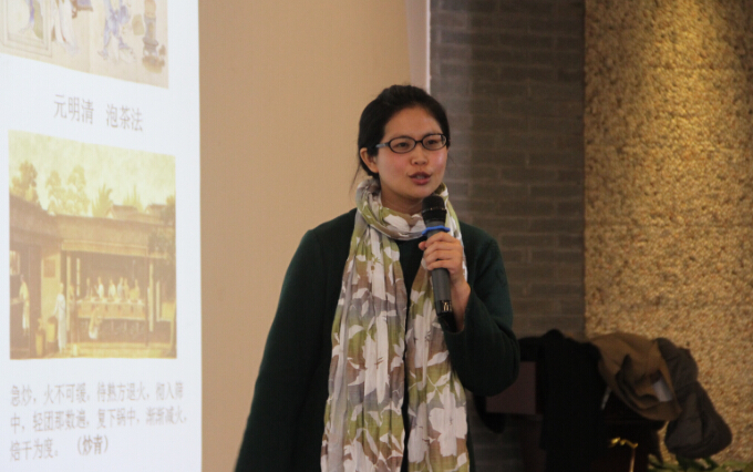 本次茶会是一次看、品、听与行的体验式茶会。活动前,大家观赏了现场各式茶具,品味了特制红茶。茶会开始,张海岚为听众们讲解了明前茶的特点及其价格昂贵的缘由,重点介绍了径山禅茶的历史。期间,主办方特邀请哲学系大一员工戴雨欣现场为大家演奏古筝《春涧鸣泉》,时而婉转,时而热烈,仿佛身临其境。在听曲的同时,张海岚为大家现场演示了唐代碗泡茶的方法,并邀请大家品味径山毛峰淡雅清香的茶汤。应老师们的邀请,张海岚还介绍了一款办公室养生茶的冲泡方法,老师们按照方法的介绍,现场体验了泡茶的过程。