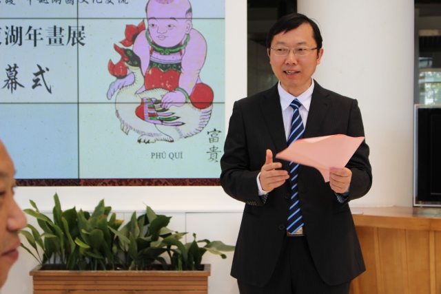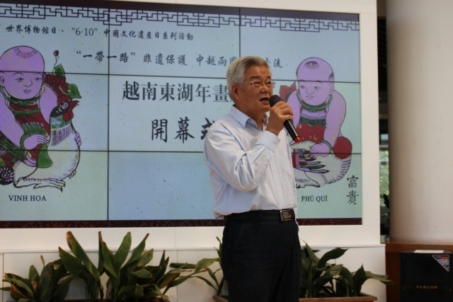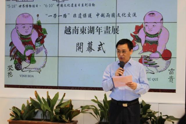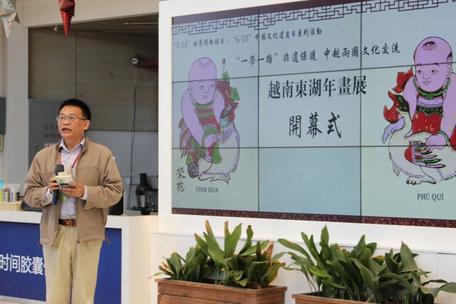 策展人田兆元介绍了本次越南东湖年画展的目的和意义。他说,博物馆建设是国 家文化战略,在国家文化传承,社会教育中发挥着重要作用。本次越南东湖年画展始于十多年前越南职工的学习交流,是“一带一路”中越两国文化教育交流活动的珍贵历史再现。民俗博物馆将积极推进越南东湖年画的展览馆的建设,为“一带一路”的文化交流贡献力量。