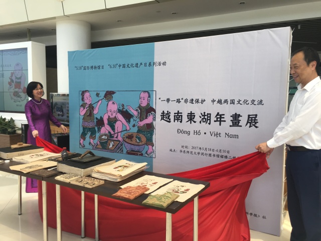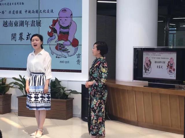 开幕式上,戴立益和阮青梅分别代表华东师大和越南驻上海总领事馆为东湖年画展揭幕。随后,阮有果和越南职工在现场分别进行了越南东湖年画创作表演和越南传统歌舞表演。音乐学系石春轩子及其弟子王丽云一同演唱了《芦花》《刘三姐》,高超的演唱水平,令人称奇,把气氛带入高潮。参加开幕式的嘉宾和师生们一起进行了年画的现场拓印体验并参观了展览。