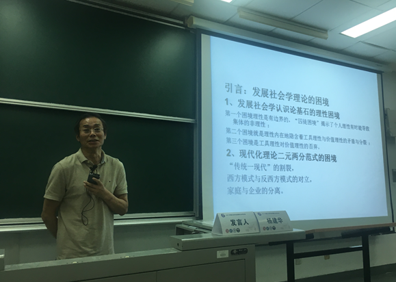 浙江省社会学会会长、浙江省社科院社会学研究所杨建华研究员作了题为《发展社会学理论研究的一个框架》的发言。杨建华研究员认为,对中国发展社会学研究而言,中国社会发展的实践先于社会发展理论,中国社会发展过程中出现理论滞后于实践的缺场。当前发展社会学理论集中面临三大困境:发展社会学认识论基石的困境;现代化理论二元两分范式的困境以及研究对象与方法的困境。这呼唤着建构更具本土解释力的发展社会学,实现社会发展的理论自觉。